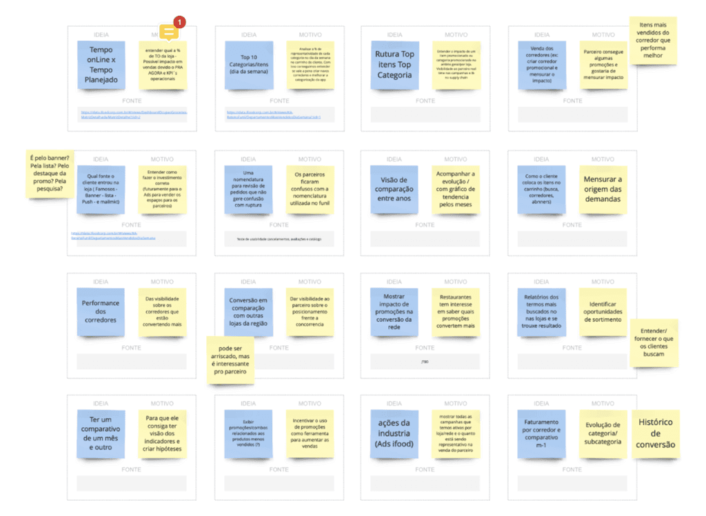 The information was then taken to the executive team, which works directly with the partner. In the dynamics carried out, the executives, together with the PDs and PM, sought to answer the following question: "What do we consider relevant to the partner in relation to catalog conversion indicators?". Along with the needs of the partners, the participants in the dynamic brought the reason why they consider that need relevant.