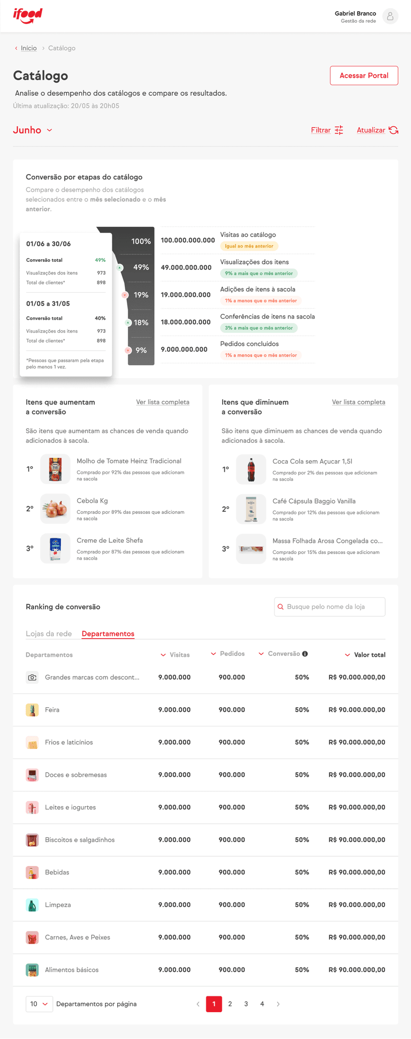 The designed interface displays details of the store's catalog performance in the app, highlighting the conversion funnel, conversion rankings by item, and by department.